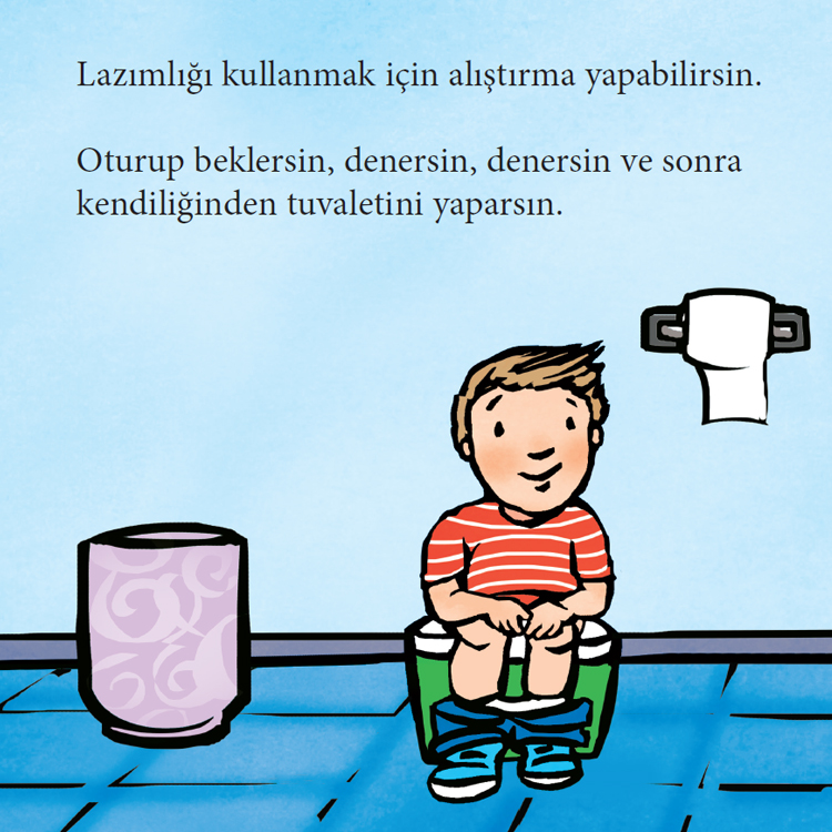 Tuvalet eğitimi, sabır ve pratik gerektirir. Küçük çocuklar tuvaleti nasıl kullanacaklarını ve neden bunu yapma zamanının geldiğini öğrenirken, hayatlarındaki bu önemli dönüm noktasıyla yüzleşmek için cesaret ve özgüven kazanırlar. Küçükler "büyük çocukların yaptığını yapmayı" öğrendiklerinde artık bezlere ihtiyaç duymayacaklar. Kitabın sonunda yer alan bölüm ise ebeveynler ve diğer bakım verenler rehber niteliğinde.