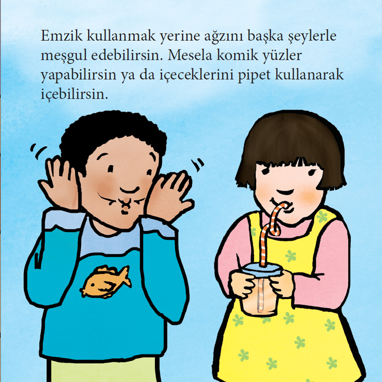 Birçok küçük çocuk için emziği bırakmak önemli bir dönüm noktasıdır. Bu kitap, geçişi kolaylaştırmak ve bunu hem çocuklar hem de yetişkinler için olumlu bir deneyim haline getirmek için sıcak, rahatlatıcı sözler ve resimler sunar. Odak noktası stresi en aza indirmek, kayıp ve hayal kırıklığı duygularıyla başa çıkmak, emzik olmadan yapılacak eğlenceli şeyler bulmak ve sonunda emziksiz olmaktır.